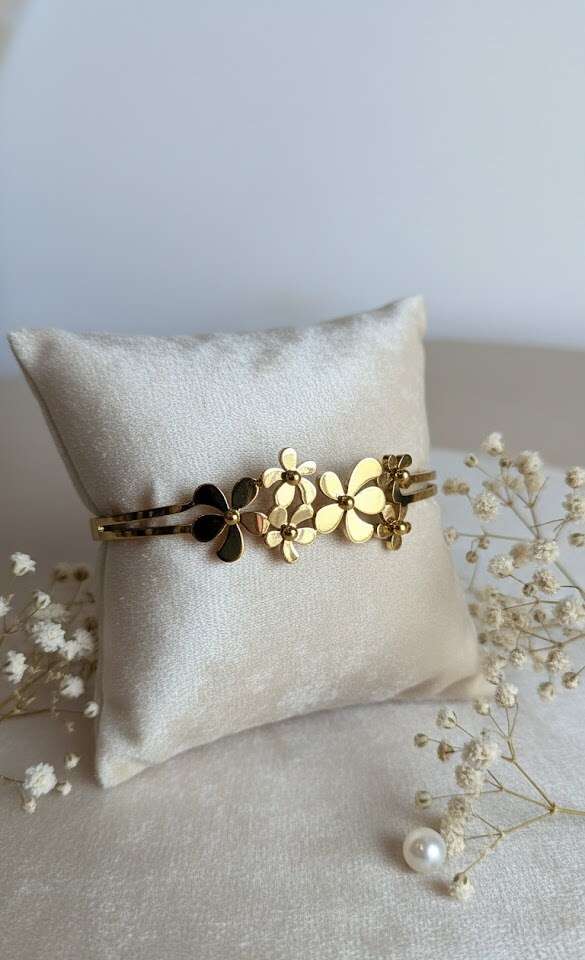 Enhance your elegance with this beautiful floral bracelet, designed for women who love minimalist yet classy accessories. The bracelet features a delicate floral pattern crafted with precision, giving it a chic and timeless appeal. Its non-open design ensures a sleek and seamless look — simply slide it over your hand for a snug, comfortable fit.